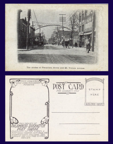 A smaller and atypical arch (though with similar motifs) over Mount Vernon Avenue – on yet another postcard available on eBay! Find it at http://www.ebay.co.uk/itm/US-OHIO-COLUMBUS-DISPATCH-ARCHES-AT-TWENTIETH-STREET-FREE-SHIPPI-/291210278760?pt=Postcards_US&hash=item43cd7c3768.