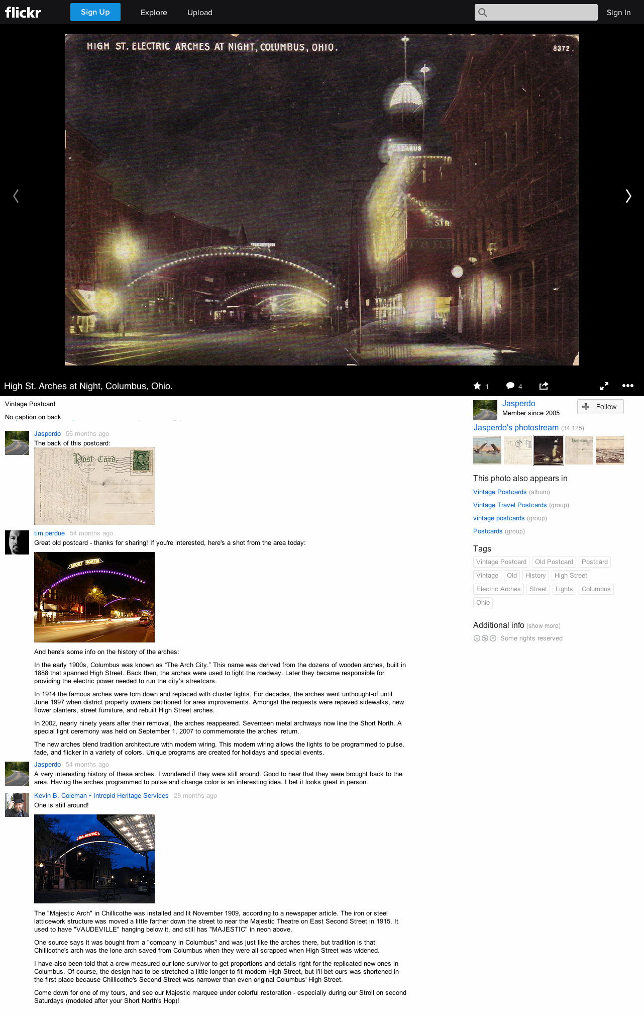A screen shot of my historical comment on a Columbus arch postcard posting…before I knew better (?). (Click on it to enlarge.)  Find this at Flikr: https://accounts-flickr.yahoo.com/photos/mytravelphotos/4311291709/.