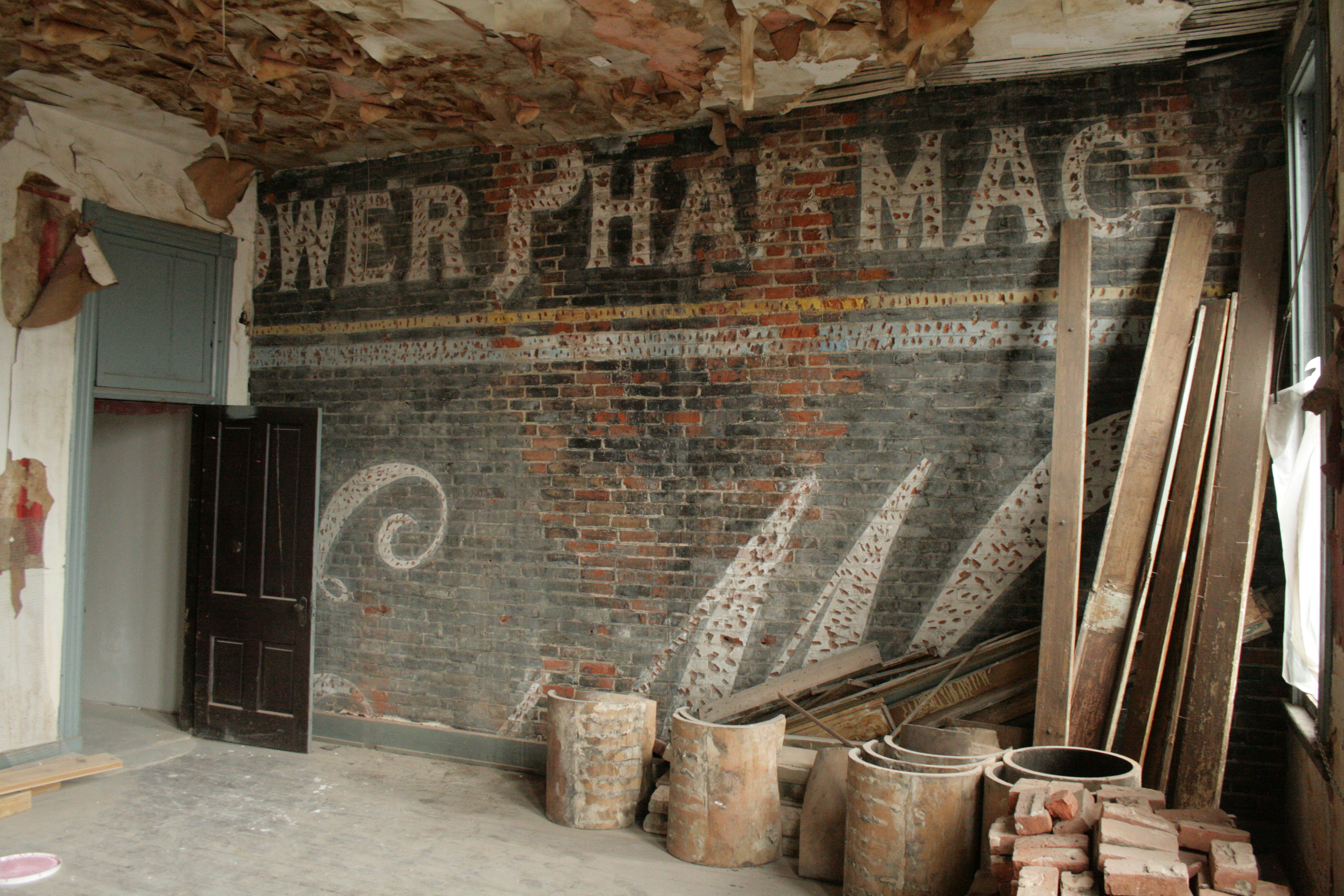 A painted sign advertising the “Tower Pharmacy” located in the Carlisle at the corner of Paint and Main had been painted on the east wall of the Carlisle Building before the Howson Building covered it over in 1894.