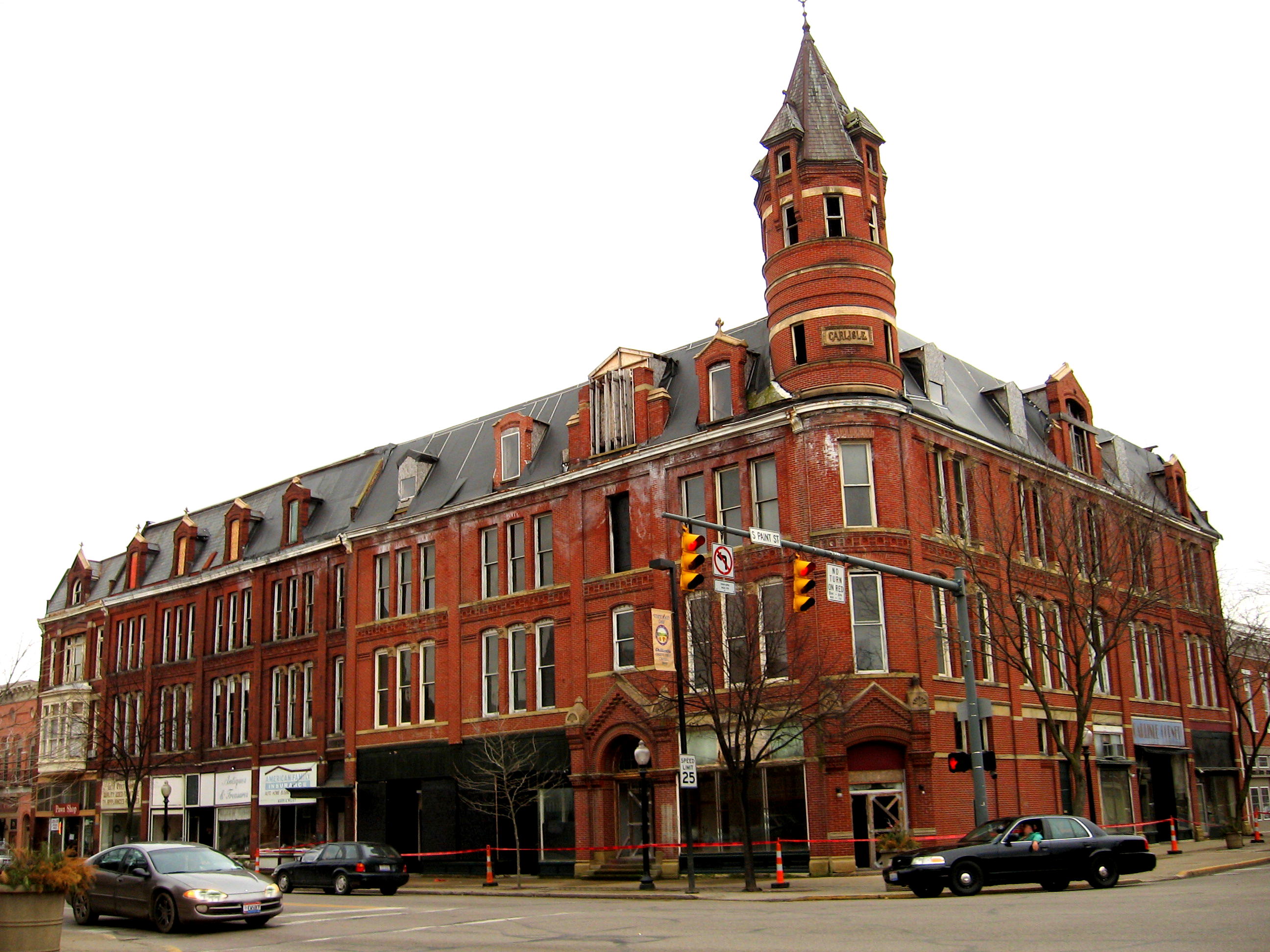 Here’s a pre-renovation view of the Carlisle Building (and neighbors), at Paint and Main streets.