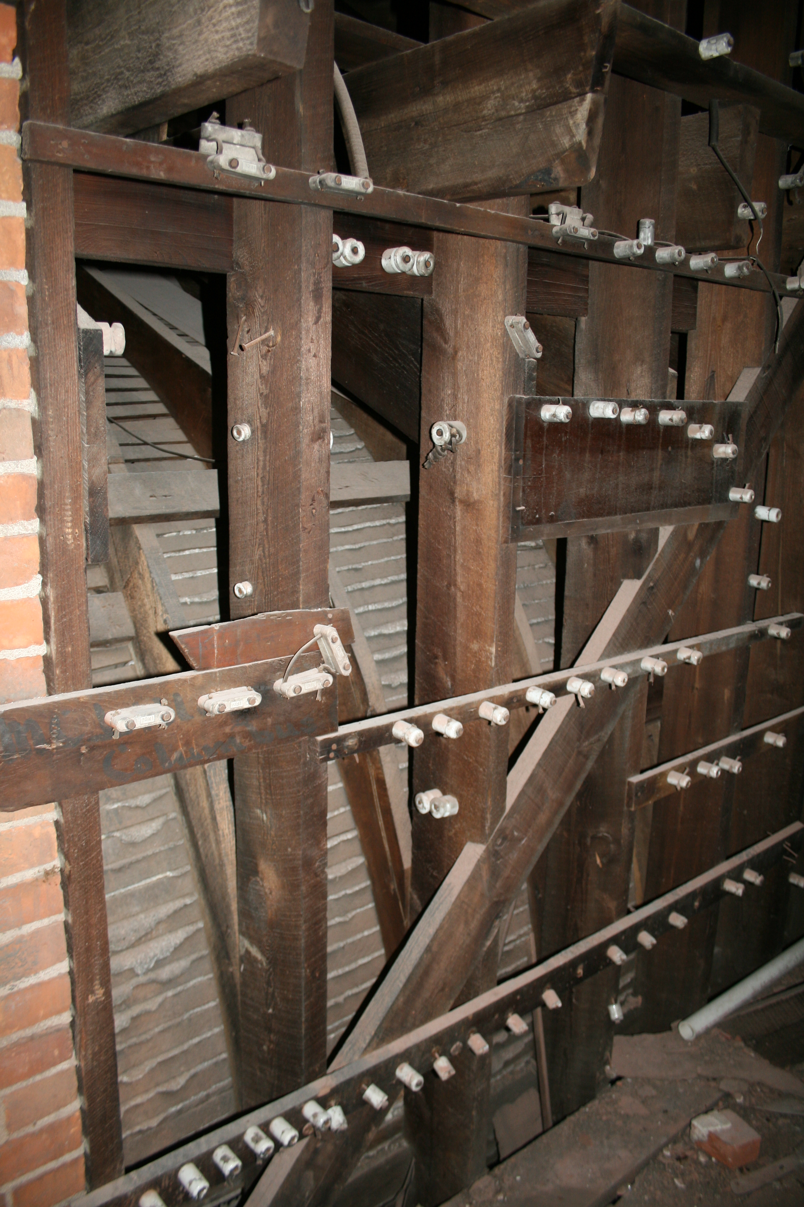 Ceramic insulators above the fuse box secured and directed the electrical wires in the attic over the coved ballroom ceiling. The wires could have been bare, or were covered in paper or cloth. They’re missing now, as is the fuse box…probably for good reason!